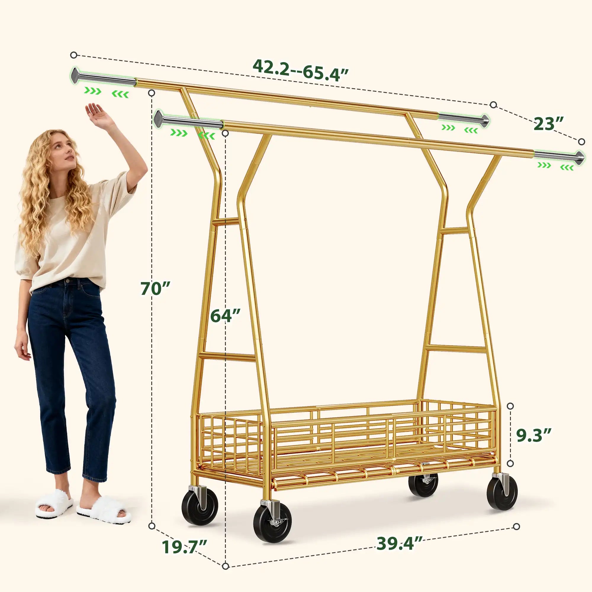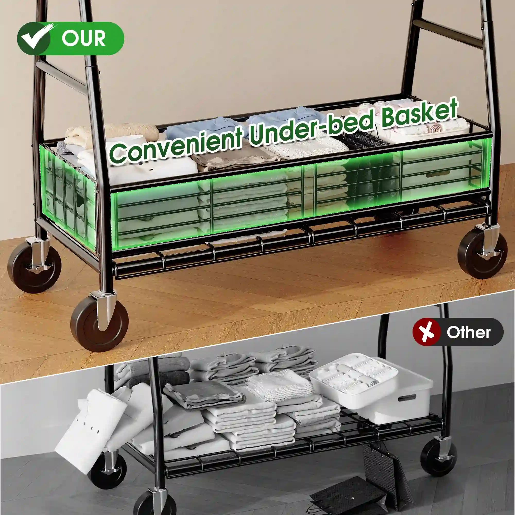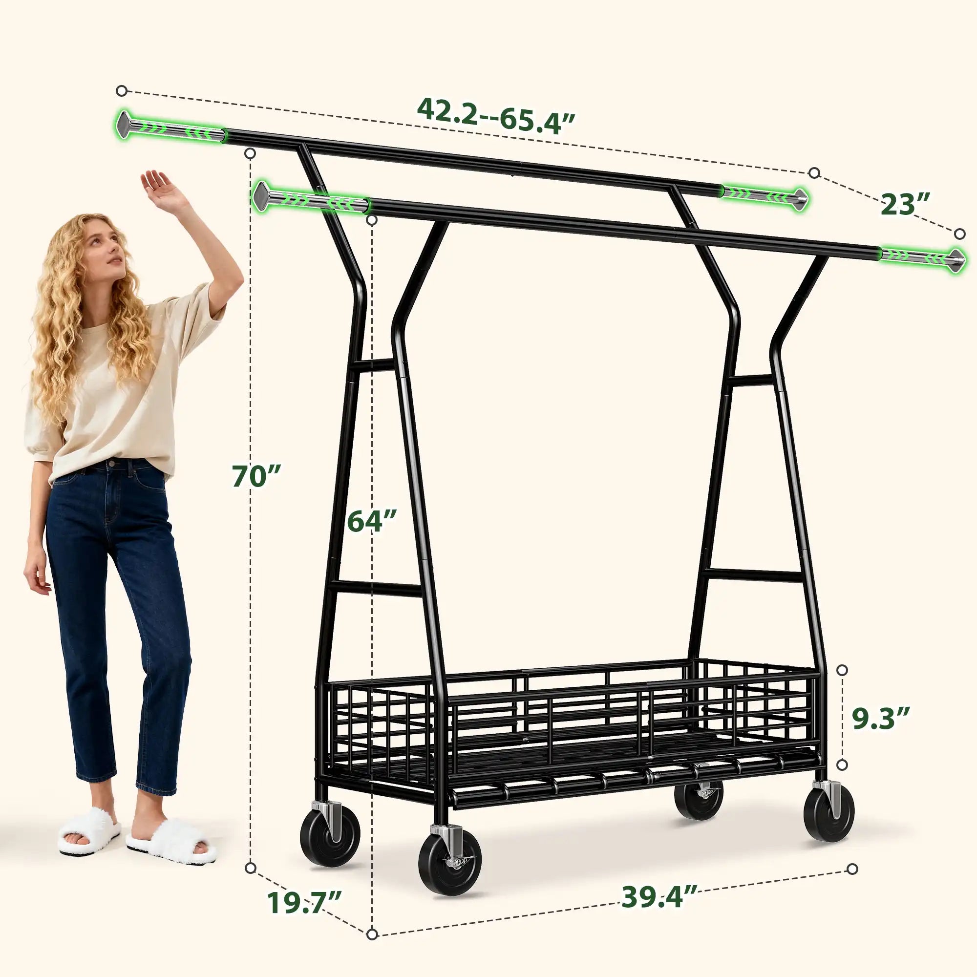 - Extra-Large Storage Space: With dimensions of 23"D x 65.4"W x 70"H, this clothes drying rack comes with two sturdy hanging rods and a bottom storage basket, offering ample space for hanging clothes and storing items like luggage,bedding, or shoes. This garment rack with wheels is also an excellent choice for commercial use, making your displayed clothing look even more attractive!