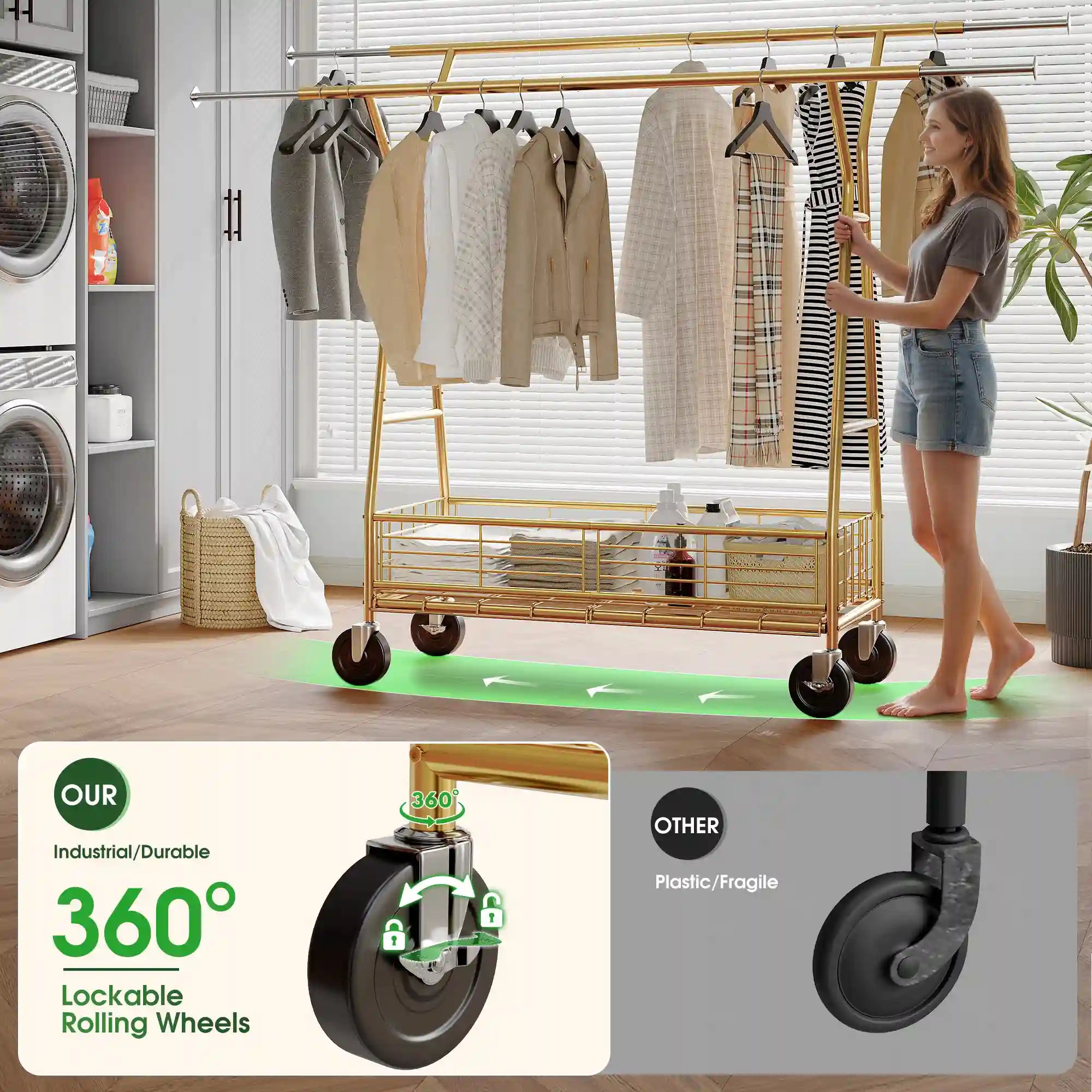 - Versatile Garment Rack: Equipped with four 360° swivel wheels (including two locking wheels), this clothes rack with wheels is easy to move around your bedroom, living room, or laundry room, adapting to your various needs.