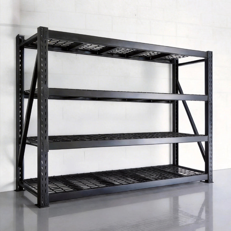 - Designed with a spacious 68-inch width and wide beam spacing, this 4-tier shelving unit maximizes storage capacity, making it easy to organize bulky bins, tools, or heavy equipment.