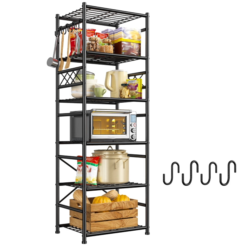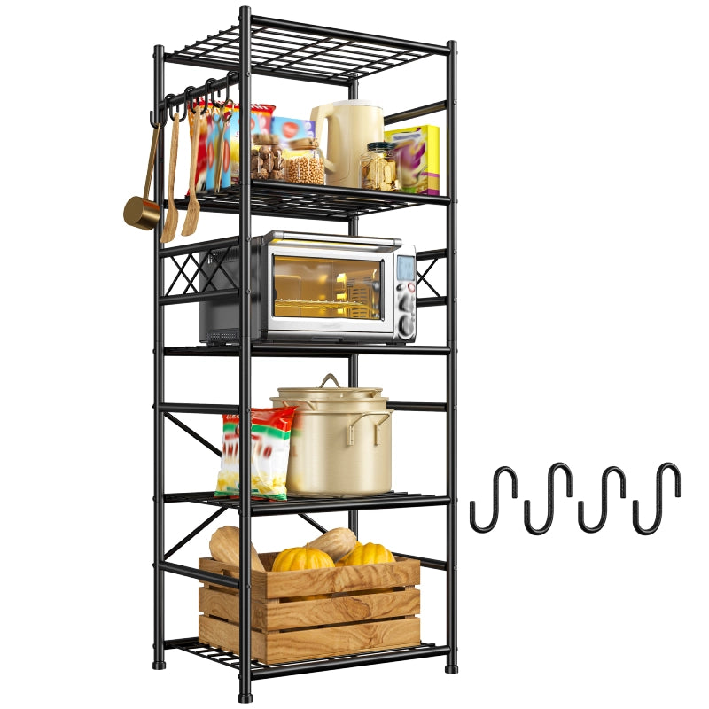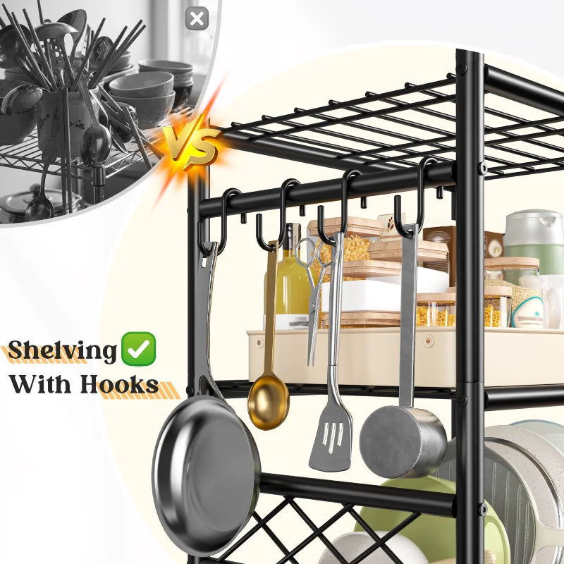 Innovative side hooks add hanging space for towels/utensils (no sacrifice on load-bearing/ storage) and boost structural style/stability; 4 adjustable anti-slip leveling feet + wall-mounting kit eliminate wobble/tipping—rock steady even when fully loaded on uneven floors.