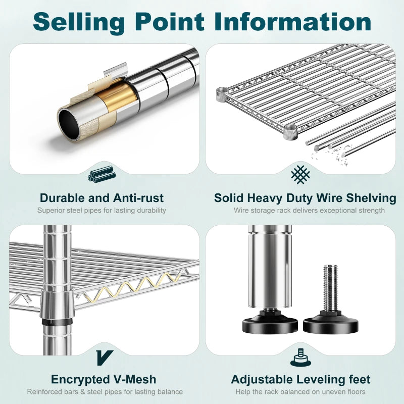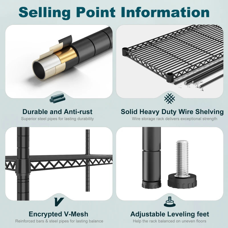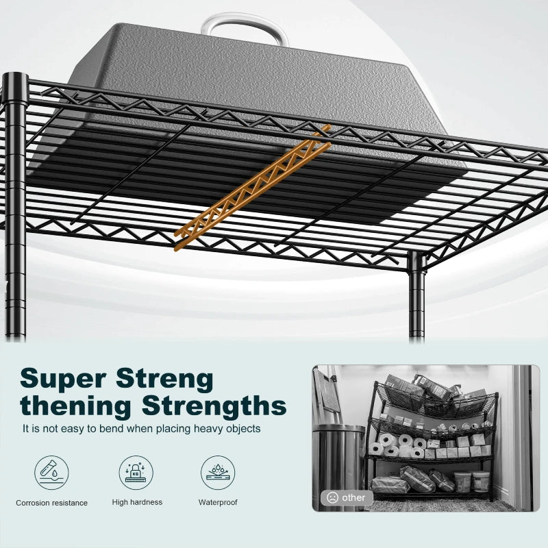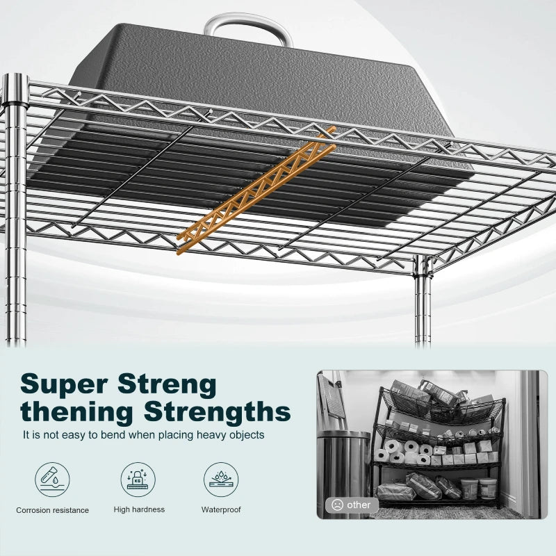 Crafted from high-quality rust-resistant steel, this shelving unit is designed for long-term use. The reinforced V-shaped grid design adds extra strength and stability, while the adjustable leveling feet help keep the rack balanced even on slightly uneven floors.