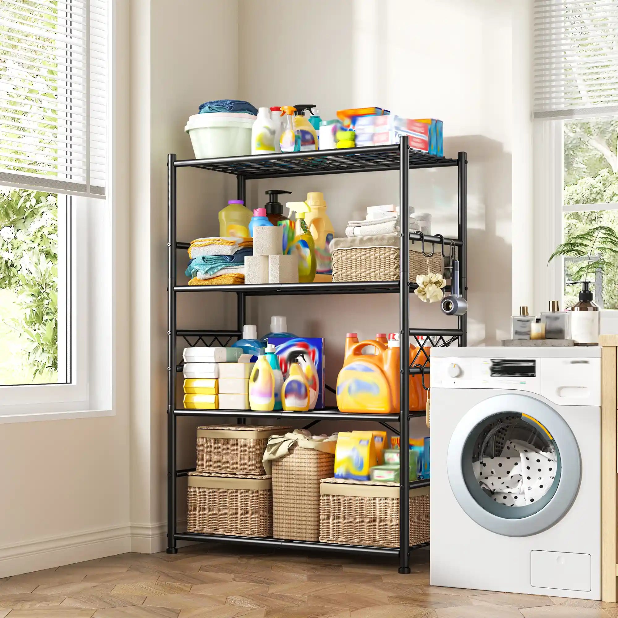 Maximize your storage space and convenience. Our shelving unit comes equipped with hooks on both sides, perfect for hanging tools, cables, or cleaning supplies. This thoughtful addition not only enhances organization but also contributes to the overall stability and balance of the rack.