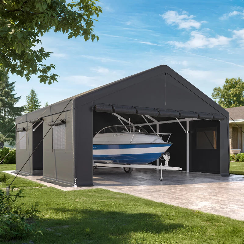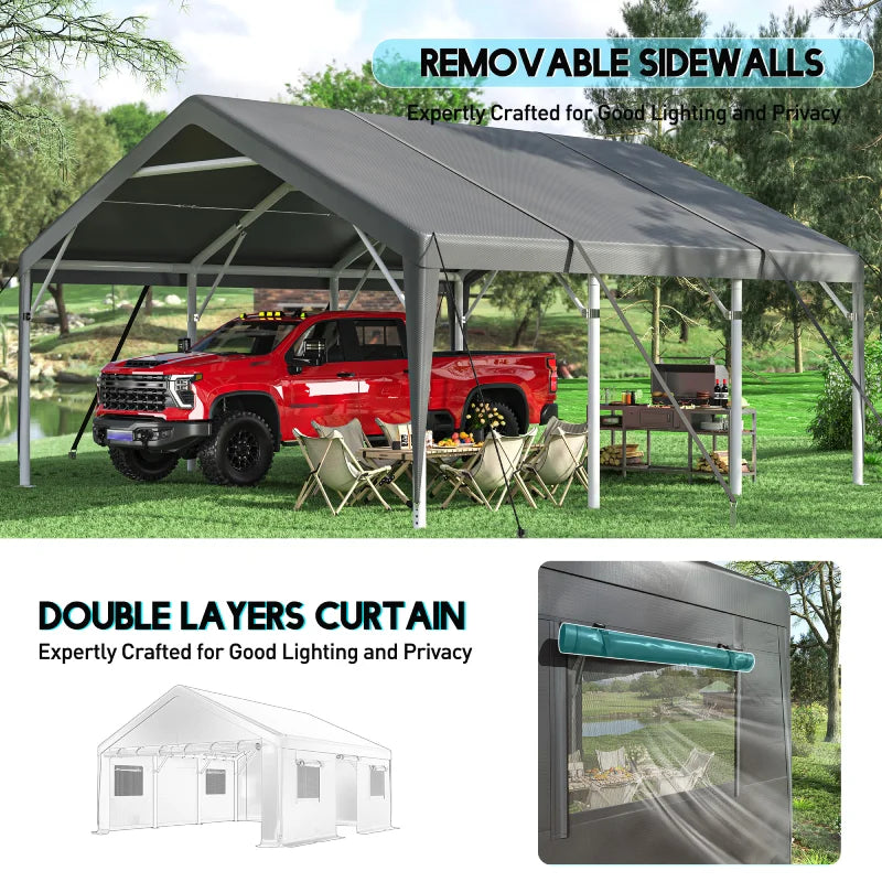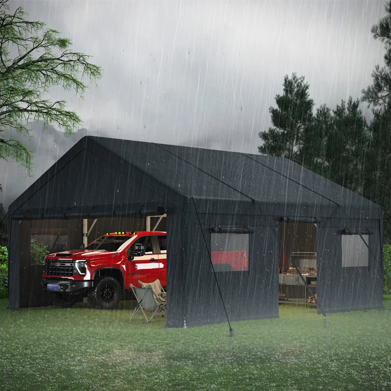 Perfect for a variety of settings, including home garages, outdoor parking lots, driveways, RV storage, camping trips, and backyard events. This multi-purpose carport shed adapts to different needs, making it a practical addition to any property.