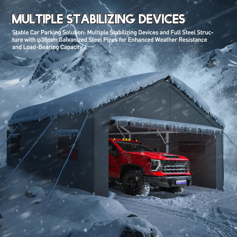 - Keep your vehicles safe with a stable carport featuring multiple stabilizing devices and a full steel frame made of 38mm galvanized pipes for excellent weather resistance and heavy-duty load capacity.