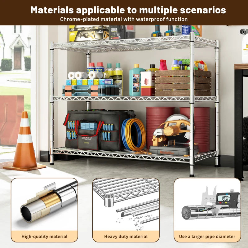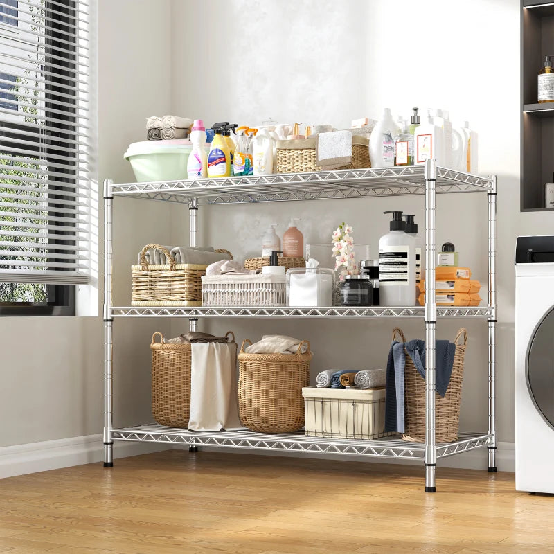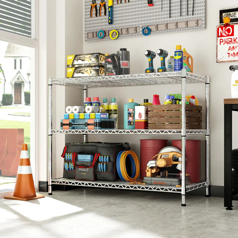 Designed for everyday organization, this 3-tier metal shelving unit provides reliable storage for kitchens, pantries, garages, and utility rooms. It helps you neatly store appliances, tools, storage boxes, and daily essentials, making it easier to keep your home organized and clutter-free.