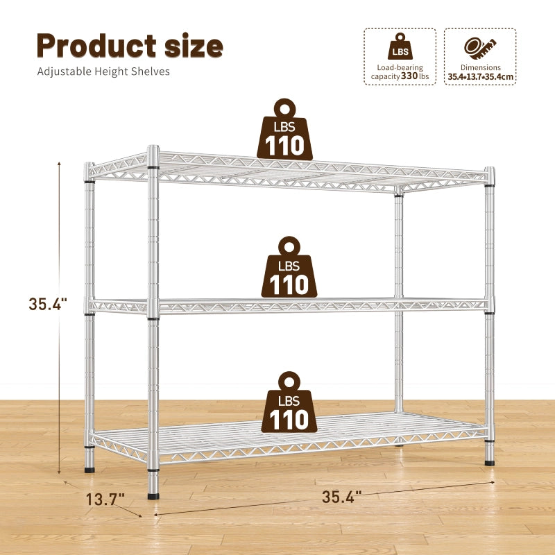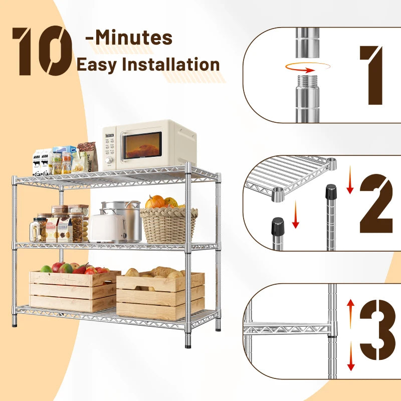 Reibii 3-Shlef Metal Shelves, Adjustable Steel Wire Shelving Units,for Kitchen Pantry,Chrome