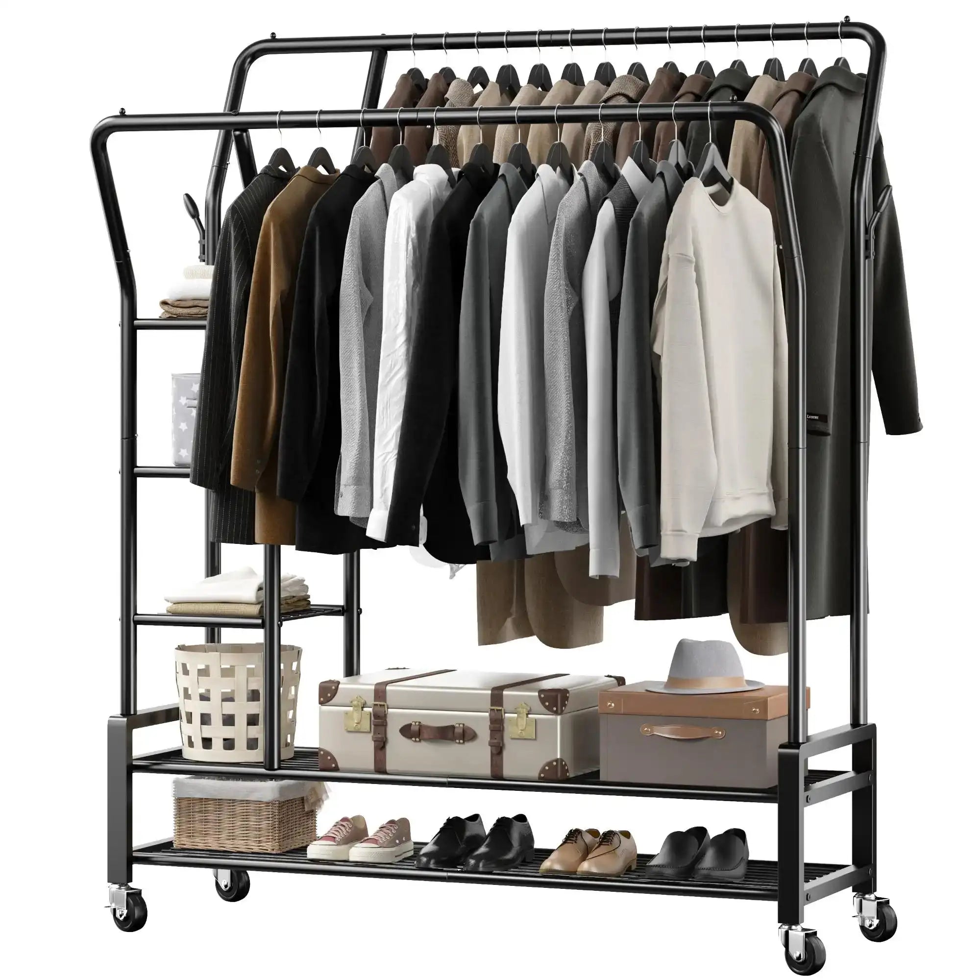 Rolling clothes rack is made of thickened metal tubes, smooth welding point, strong hanging rod that can hold up to 255LBS. Double rod garment rack offers a 4-time hanging space than ordinary clothes rack. You can put 80+ summer clothes and 20+ shoes on this clothing rack. Enough height meets all your needs to hang different sized clothing.