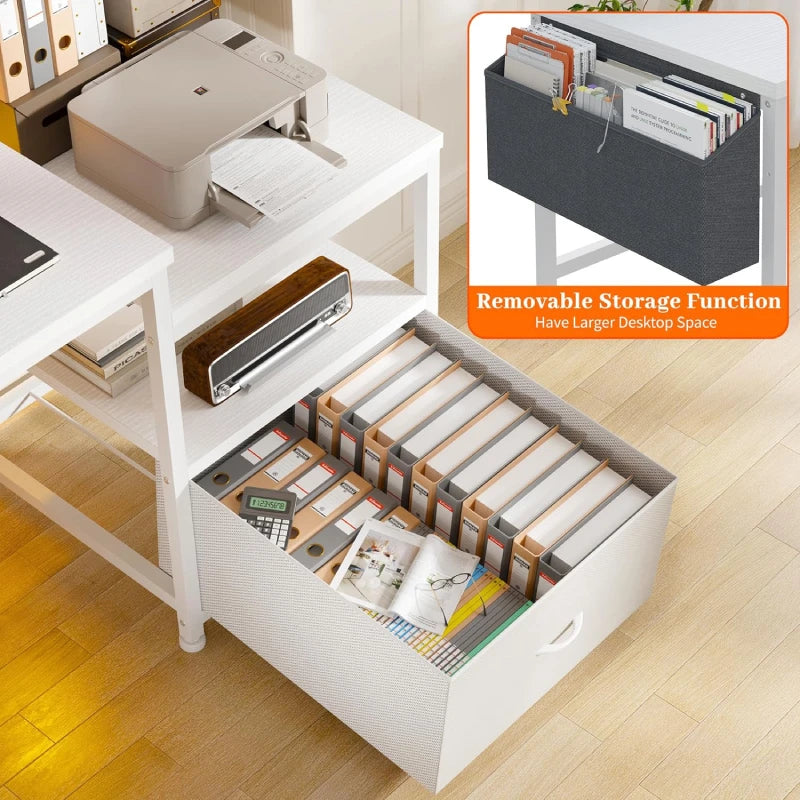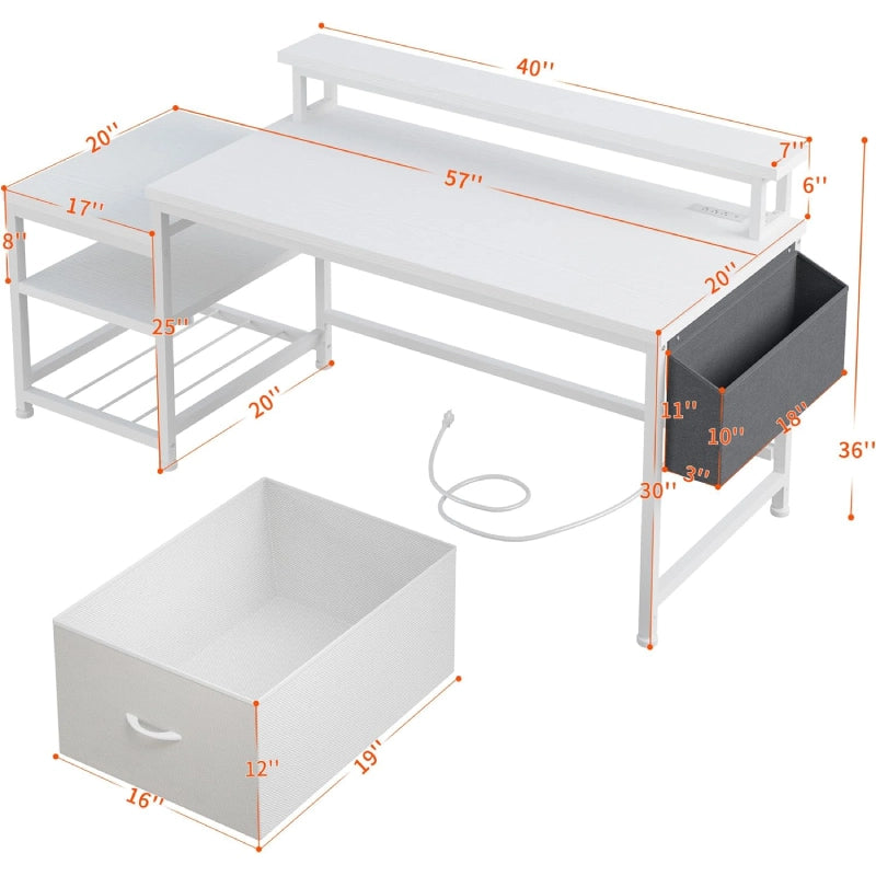 - Measuring 57"W x 20"D x36"H, this PC desk is equipped with two open shelves and a fabric drawer, catering to your diverse storage needs.