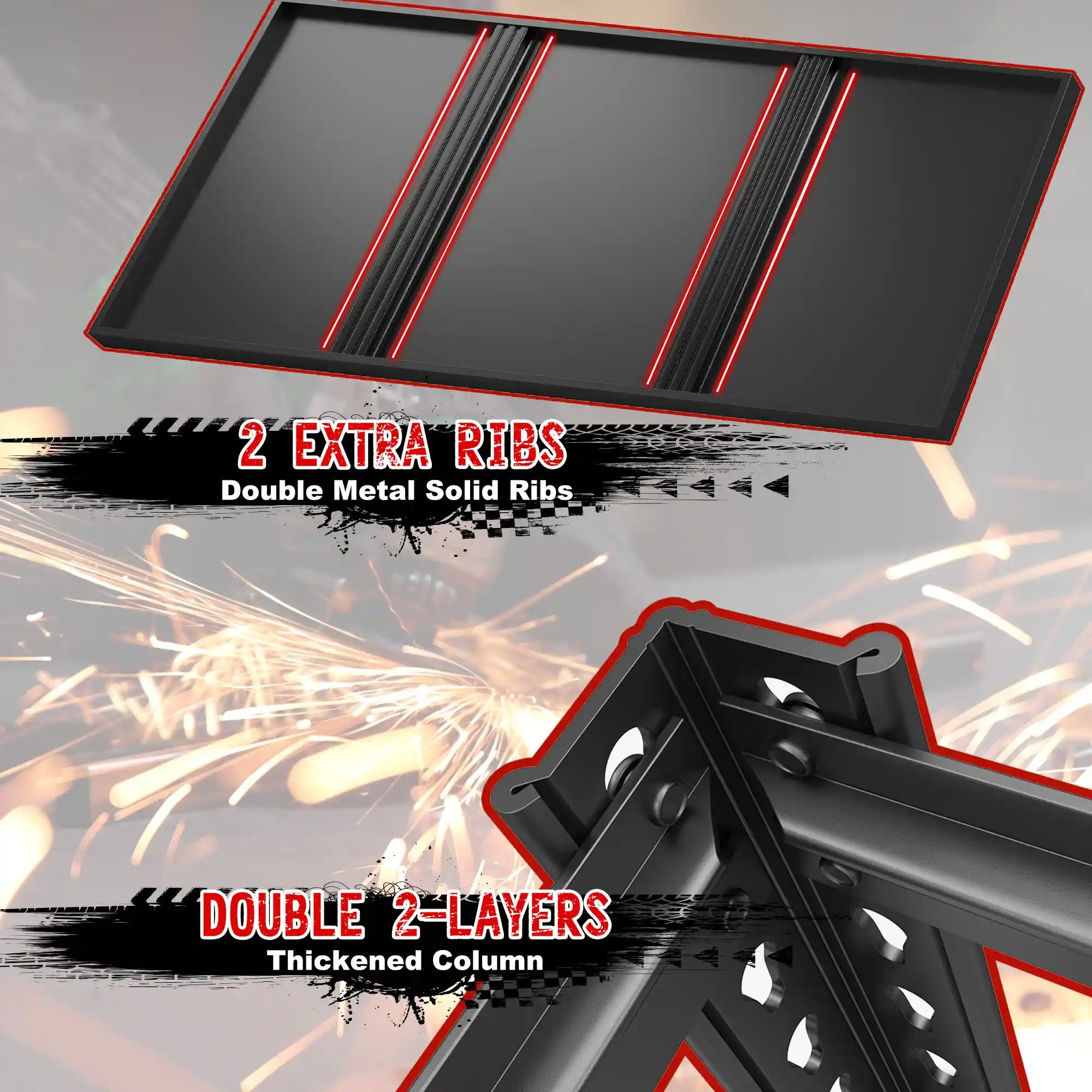 - This all metal garage shelving features padded metal legs made of high quality metal. Each metal storage shelf is equipped with sturdy thickened metal tiers and 2 RIBS embedded in the bottom of each storage metal shelf, each metal garage storage shelf can hold up to 520lbs, with a total weight capacity of 2600lbs, giving more space in your garage.
