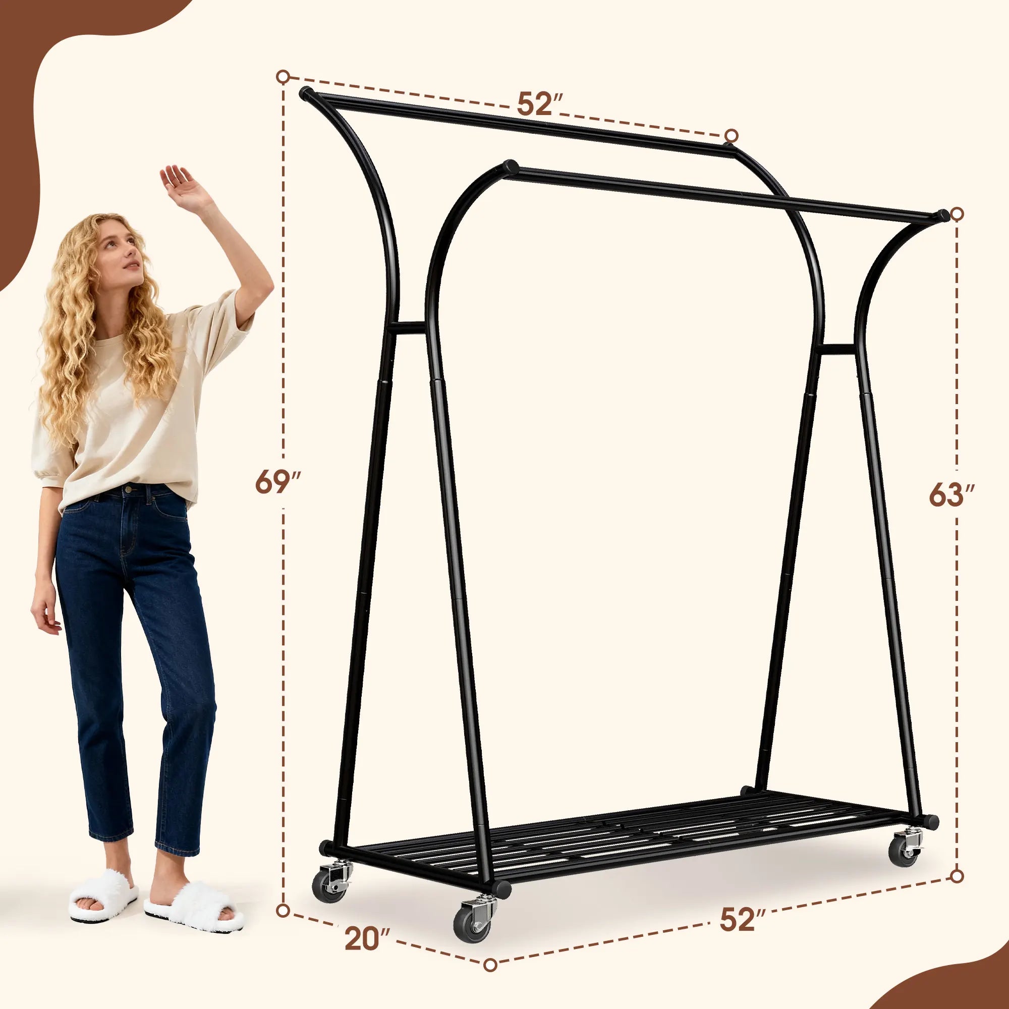 Raybee Double Rod Clothes Hanger Rack, Metal Rolling Clothing Rack With Wheels, 52"W x 20"D x (63"-69")H