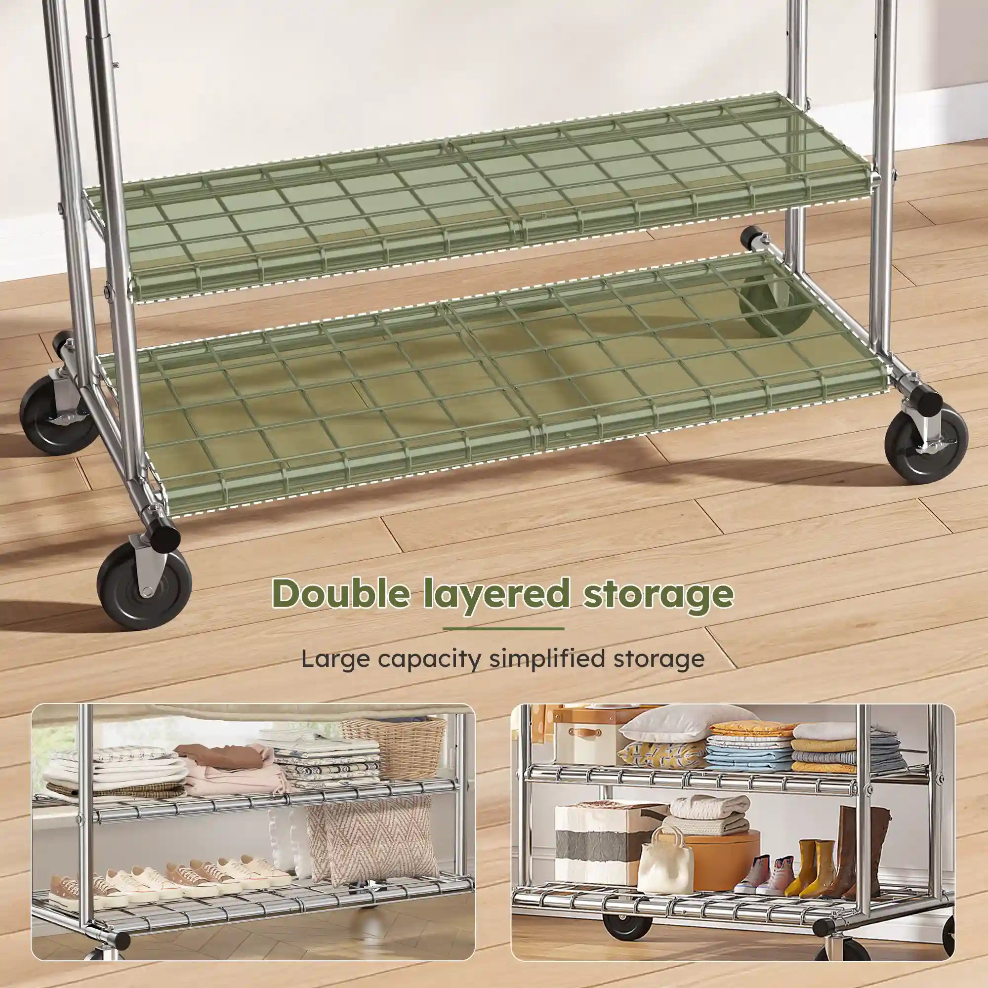 Featuring double layered storage shelves, this heavy duty garment rack offers extra space for folded clothes, shoes, or storage bins. The sturdy metal construction ensures large capacity and simplified storage, making it ideal for maximizing organization in any home.