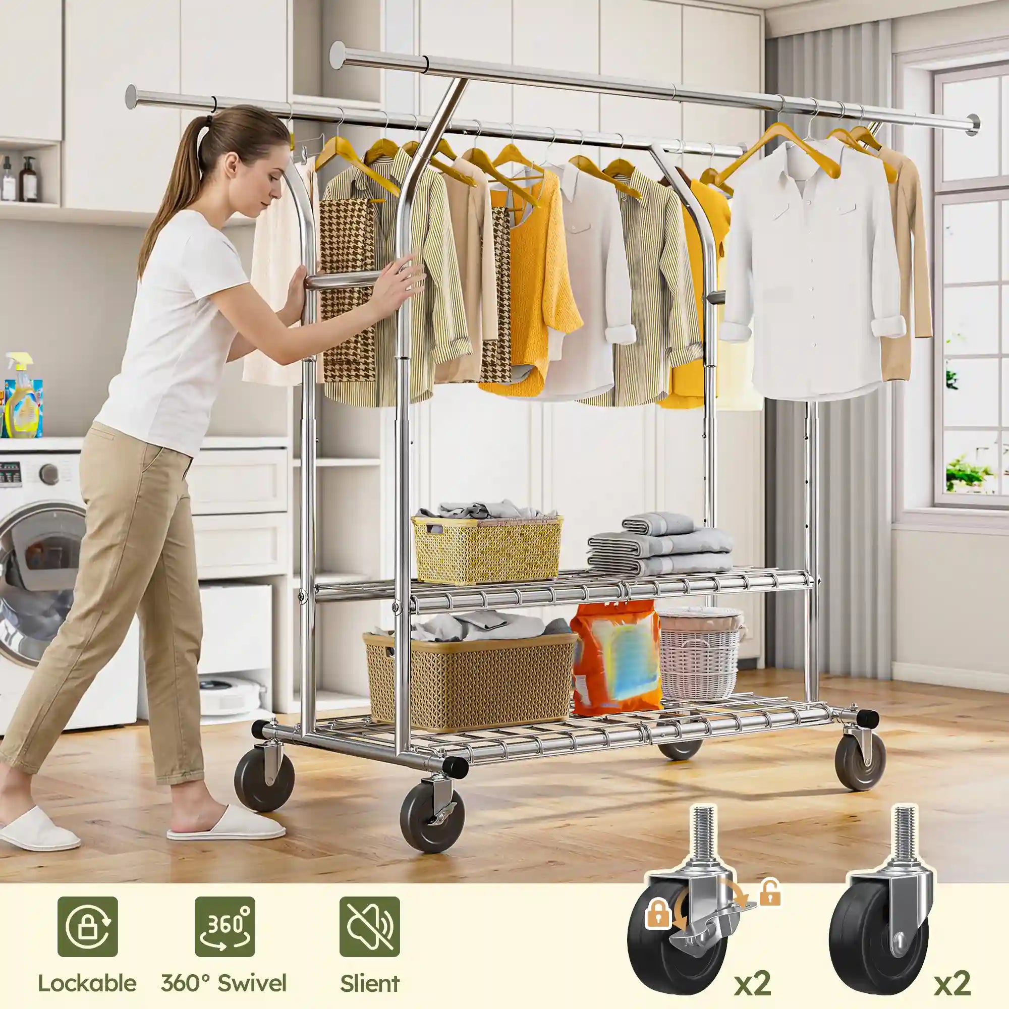 Thoughtful Rolling Clothes Rack: Featuring 360° swivel wheels for effortless movement between spaces, this metal clothes rack on wheels also includes two lockable wheels to keep it securely in place.