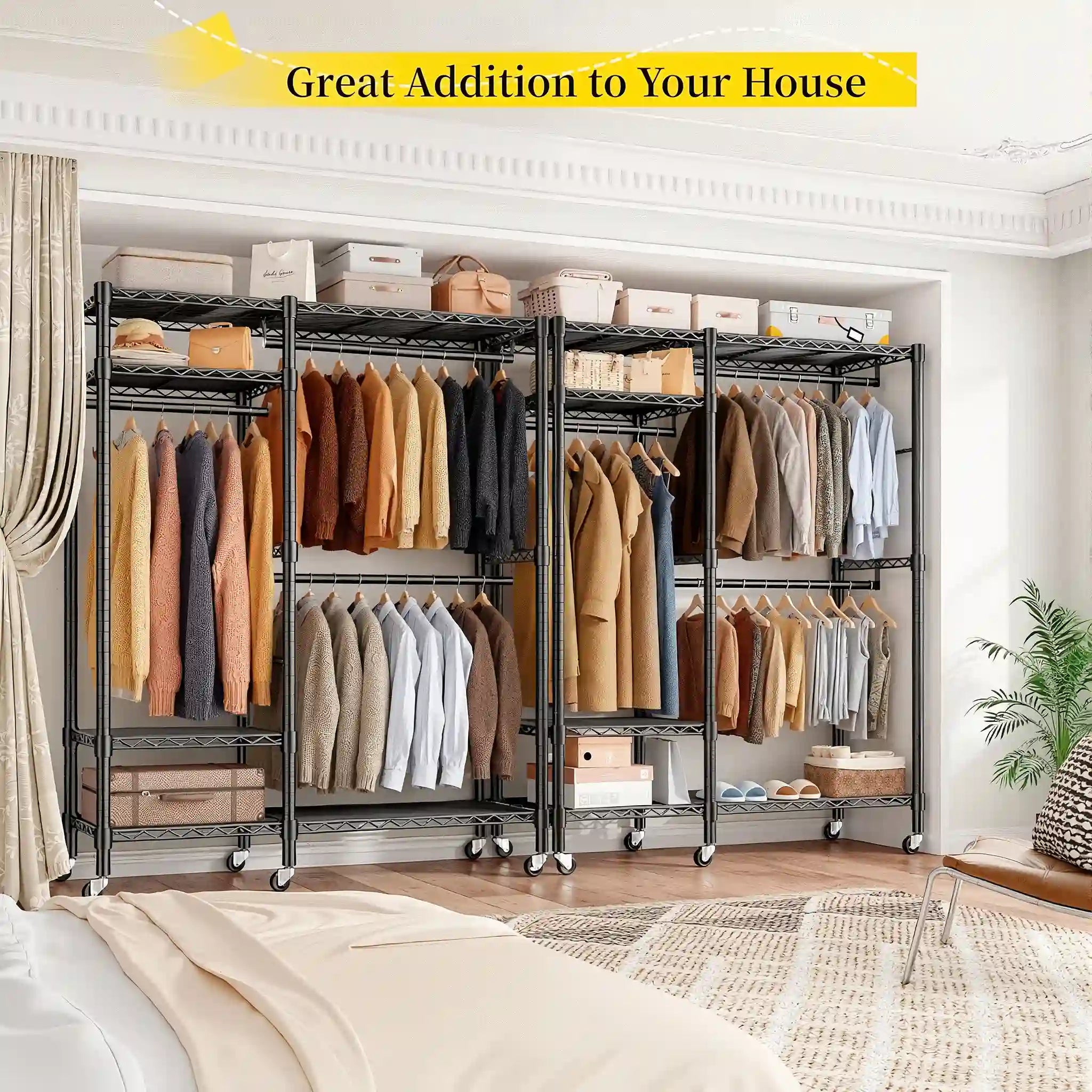 Raybee heavy-duty closet organizer are designed to fit any home layout, available in both wheeled and non-wheeled styles. The non-wheeled rack (45.5"W x 77"H x 16.5"D) is sturdy and stable for permanent placement, while the wheeled version (45.5"W x 79"H x 16.5"D) offers easy mobility for flexible reorganization. Choose from sleek black or playful pink (non-wheeled) finishes to match your space effortlessly—perfect for bedrooms, walk-in closets, laundry rooms, and more.