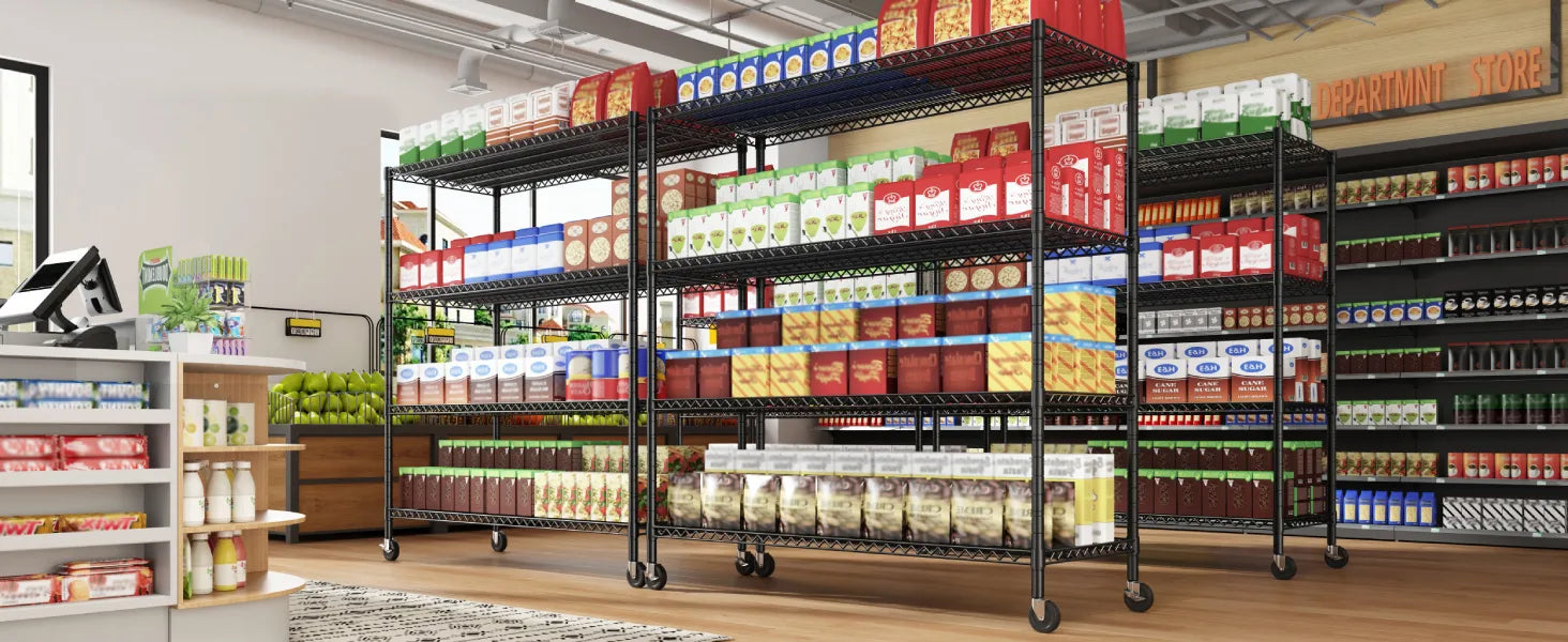 - Featuring 4 adjustable leveling feet and 4 industrial wheels (2 lockable), our heavy duty wire shelving glides effortlessly across any space while staying rock-solid on uneven floors, with a non-slip design that protects your floors from scratches. Perfect for kitchens, pantries, supermarkets, or any storage area, it’s as practical for daily use as it is a thoughtful gift or housewarming surprise.