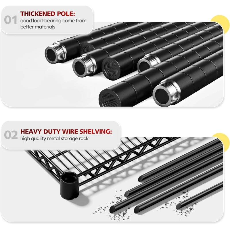 - Crafted from sturdy industrial-grade steel wire and 25.4mm metal rods, the entire wire rack is finished with a professional rust- and scratch-resistant coating, reinforced with support ribs for exceptional strength.