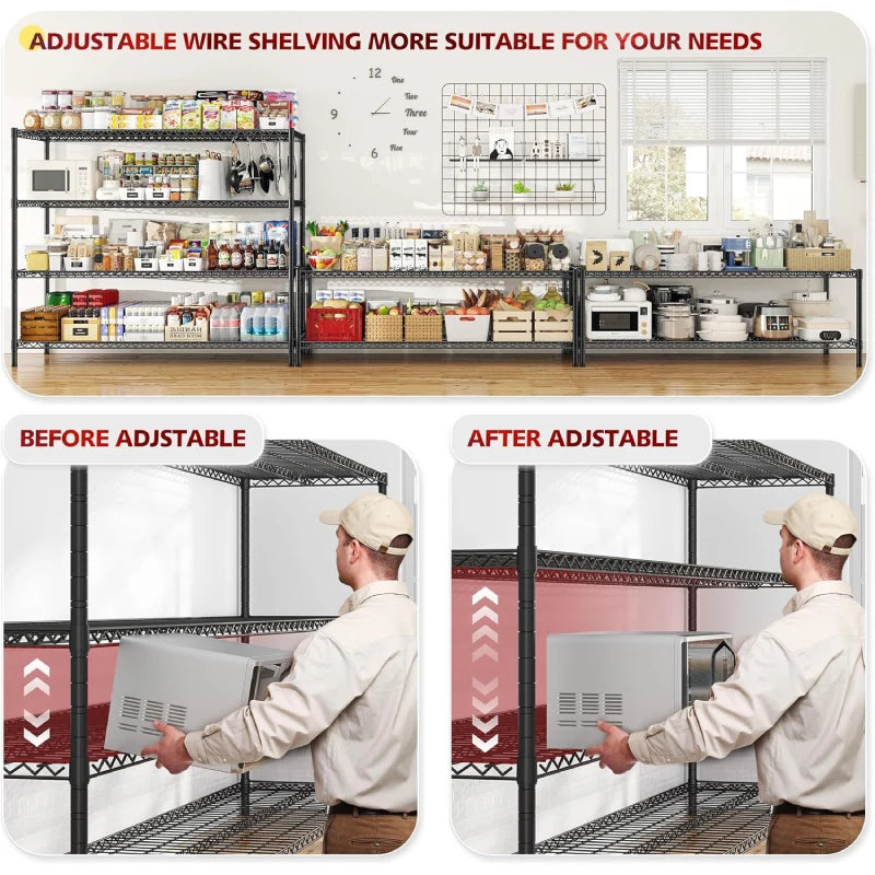 - The 4-tier black wire shelving unit expand your storage space, promoting a tidy and organized living environment. Whether placed in kitchens, warehouses, offices, or commercial spaces like exhibitions, hotels, and supermarkets, it effortlessly caters to diverse storage needs.