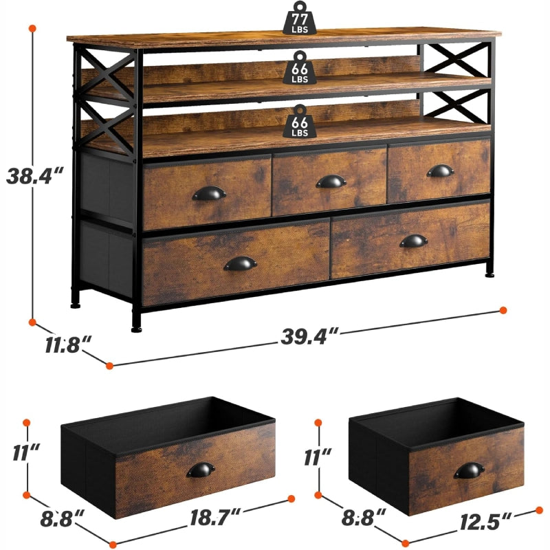 50" TV Stand Dresser for Bedroom with 5 Fabric Drawers and Wood Open Shelves for Living Room, Entryway, Closet